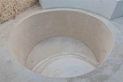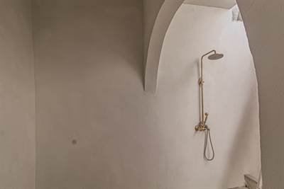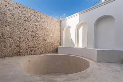 The downstairs offers a generous open floor plan, deep circular dipping pool, arched terrace, pool bath, storage and utility area. The outdoors offers exterior access for maintenance.