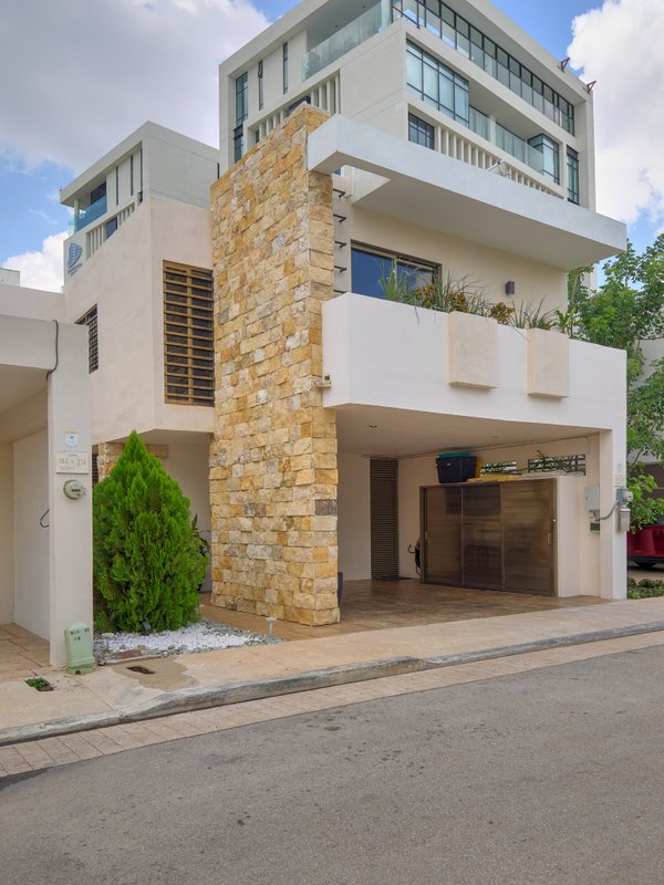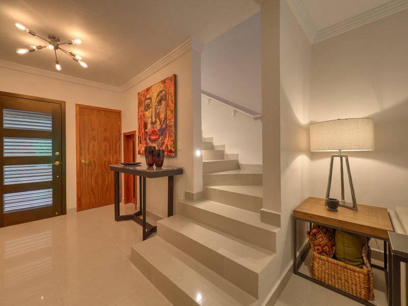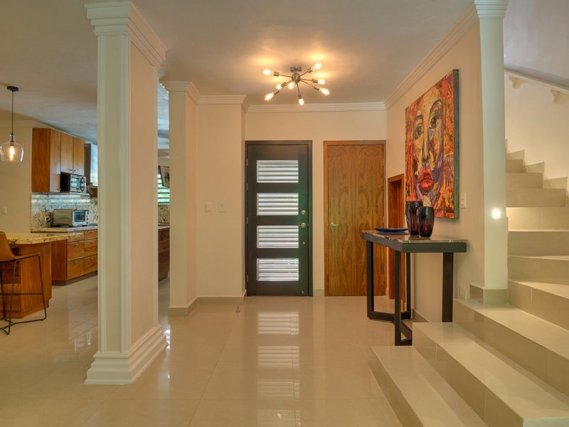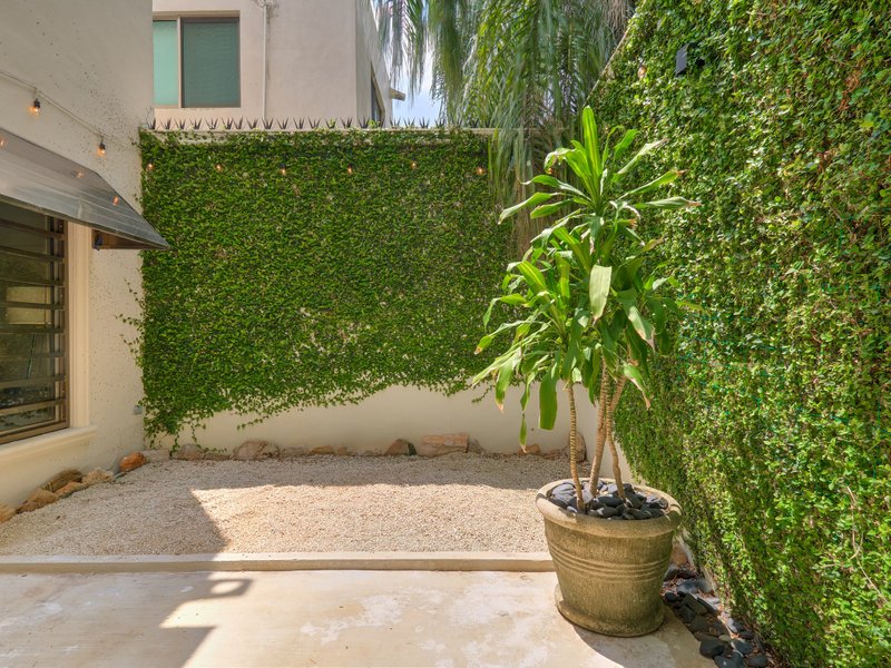 This elegantly remodeled townhouse is in San Remo Residencial, boasting a prime and secure location close to hospitals, shopping centers, and restaurants. It features numerous enhancements, such as a custom kitchen with granite countertops, 22 solar panels, air conditioning, and ceiling fans throughout. • Full AC
