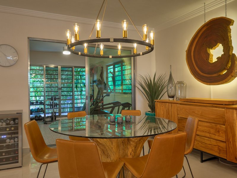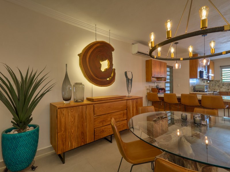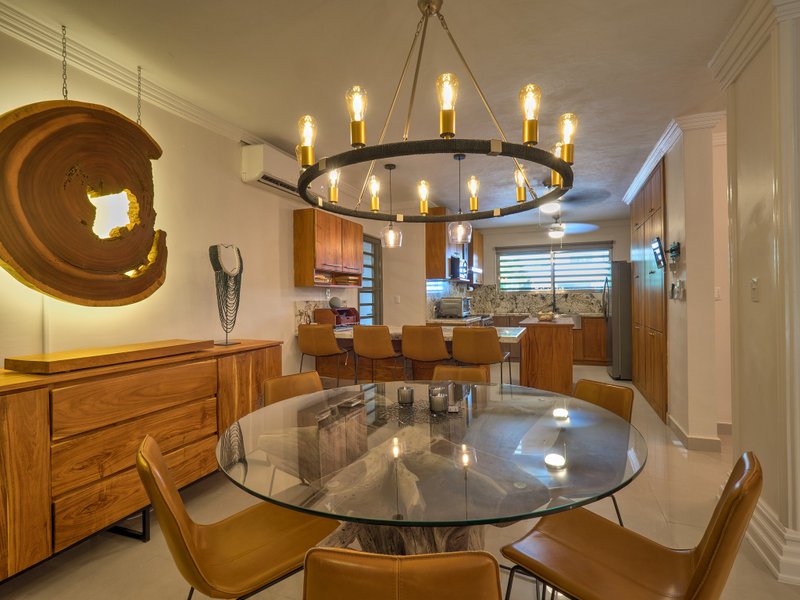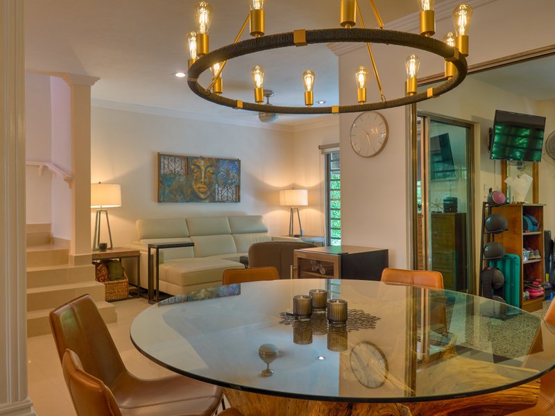 • Dining area with oversized hanging chandelier with dimmer switch, open floor plan to kitchen. 18 BTU Carrier AC unit covers dining area, & kitchen