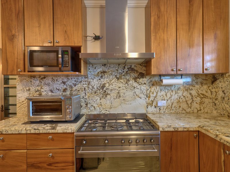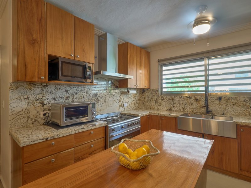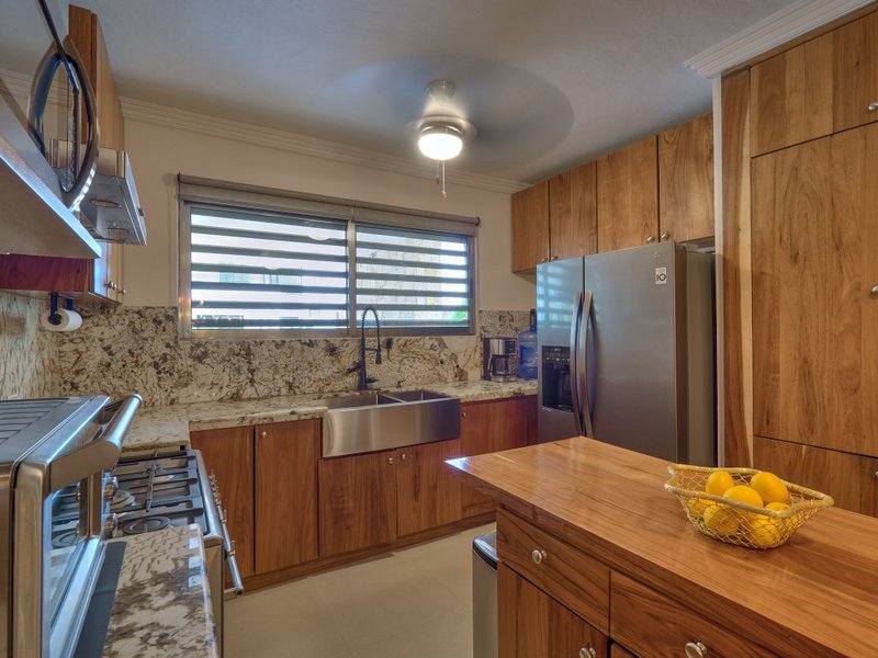 • Open kitchen with extra-large “Farm” style sink with Moen Faucet, custom wood cabinets, granite tops, refrigerator, Smeg stove, pantry, 2 ceiling fans & island with storage.