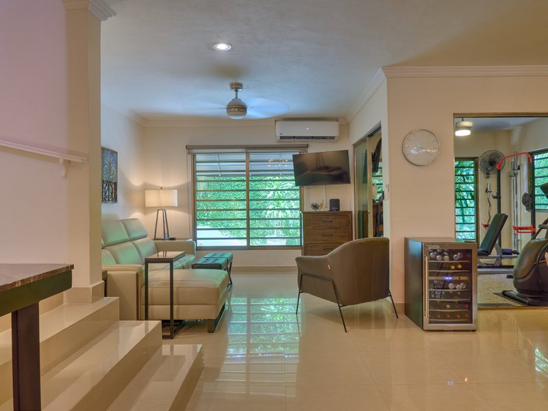 • Living room with ceiling fan and Carrier 18 BTU AC unit.