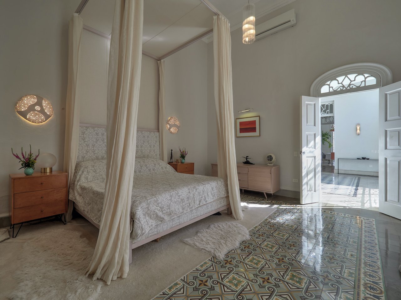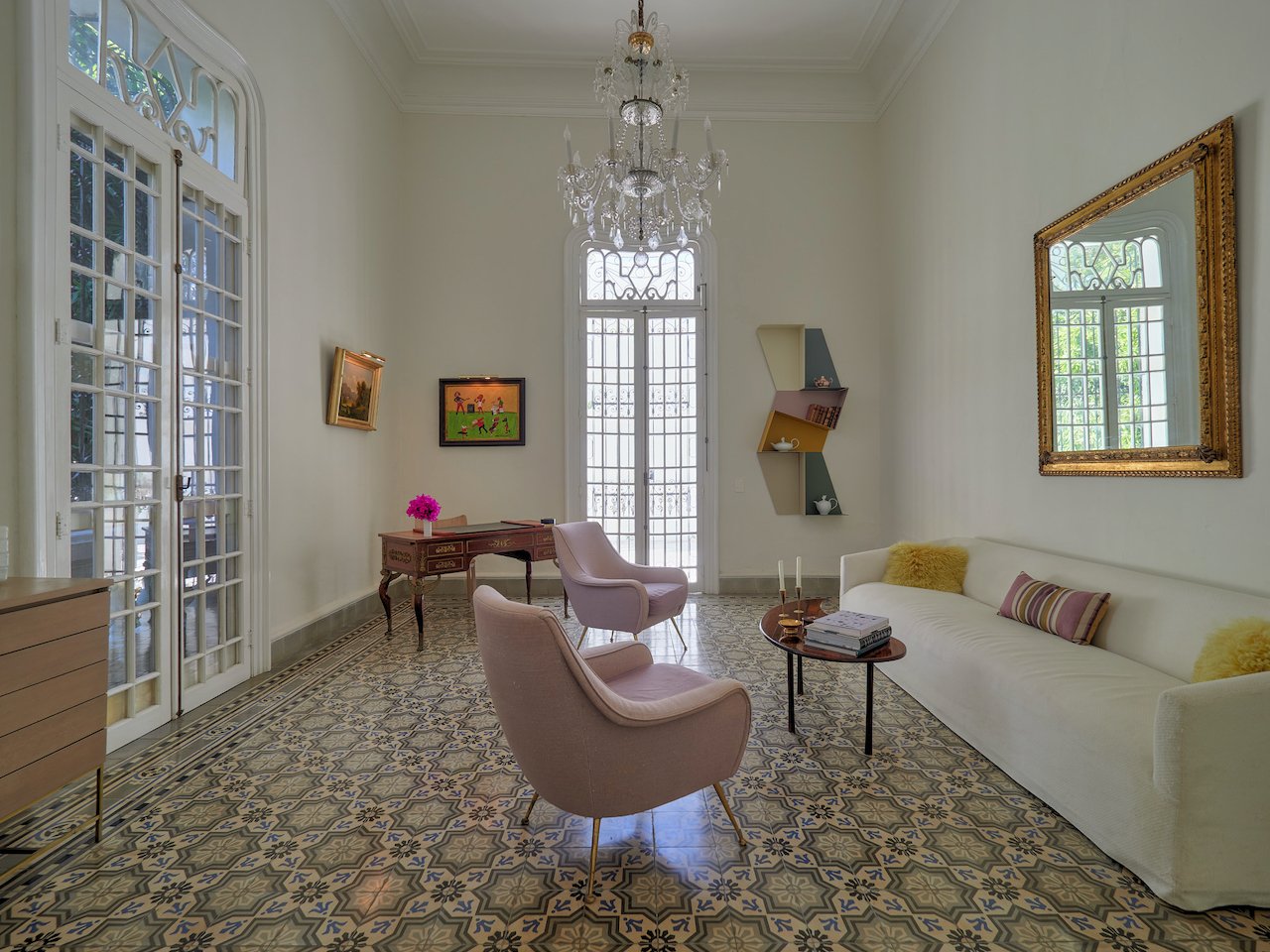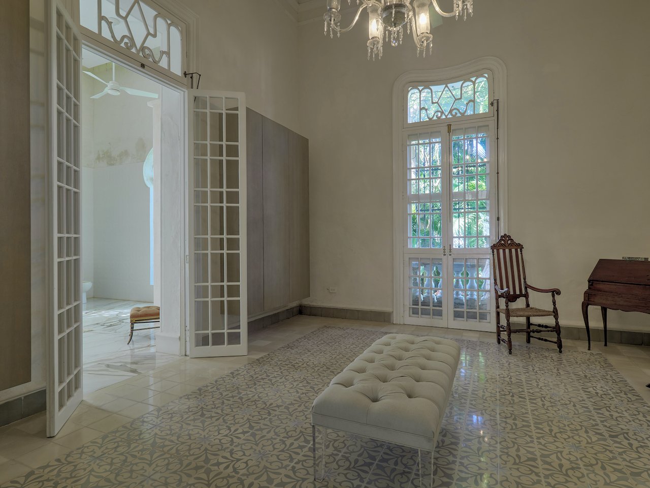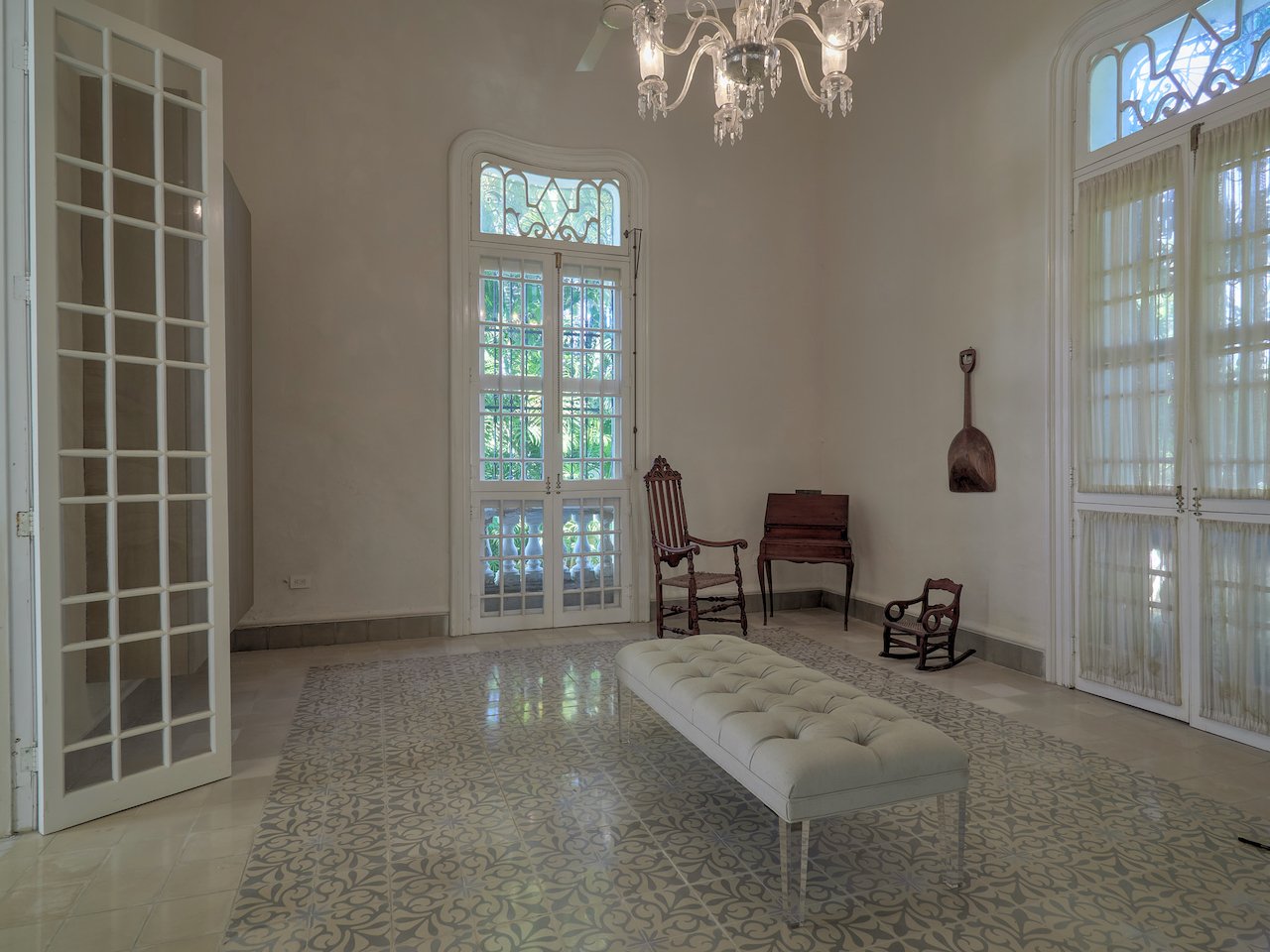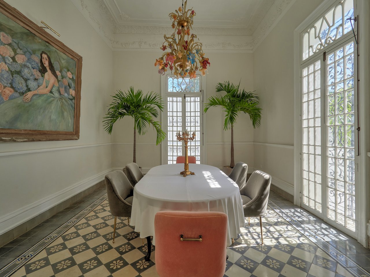 There are stunning original pasta tile floors, along with French doors on every wall bringing in light from all directions to the soaring archways and twenty-foot ceilings.