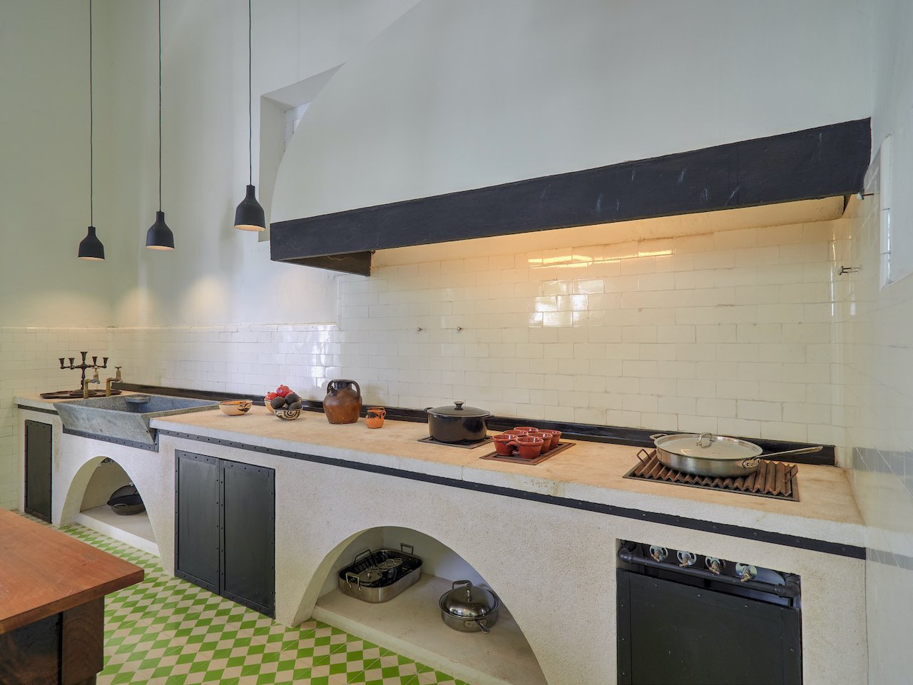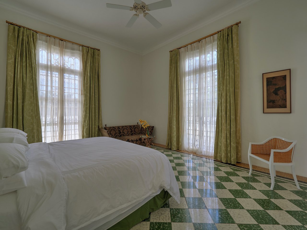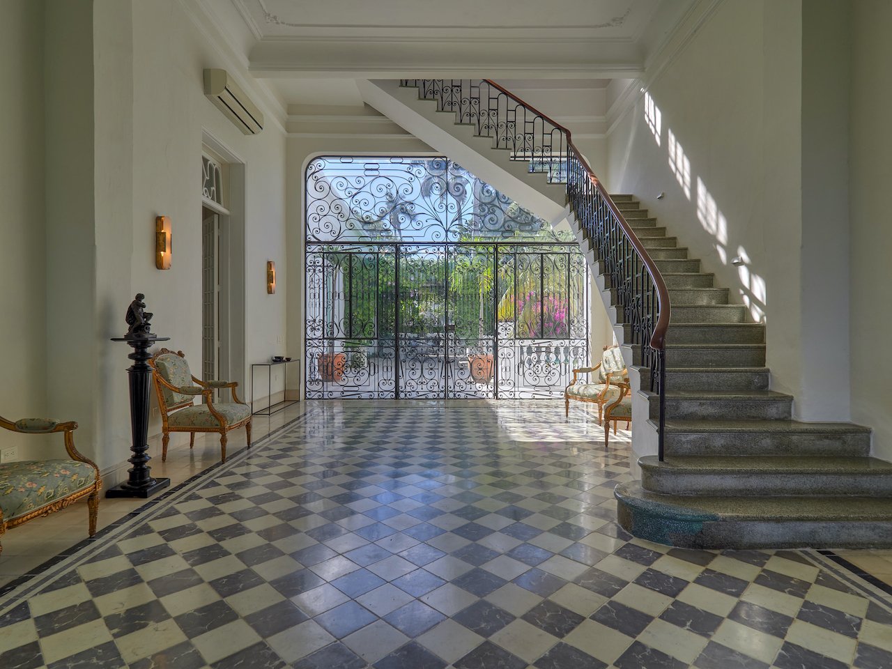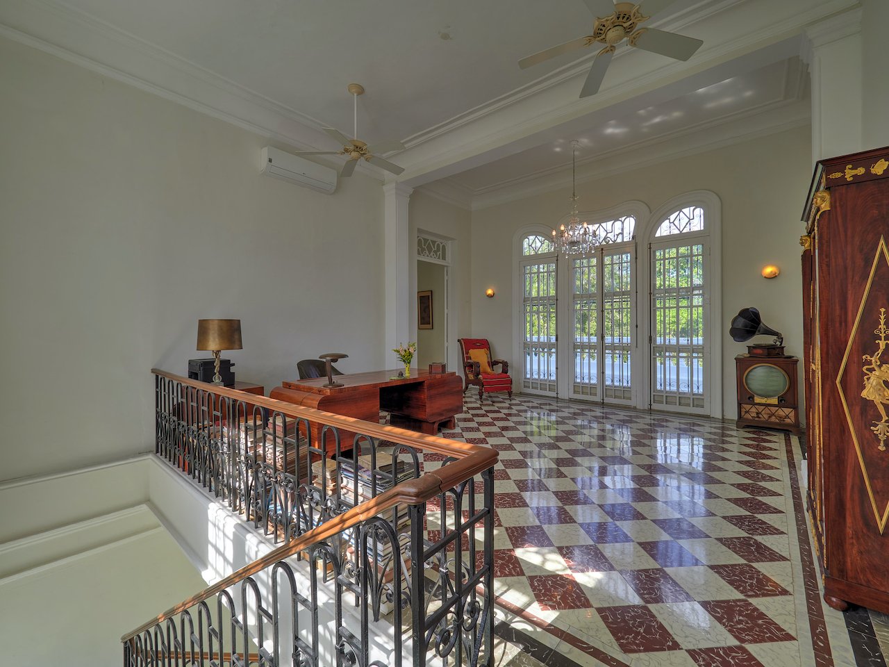 There are stunning original pasta tile floors, along with French doors on every wall bringing in light from all directions to the soaring archways and twenty-foot ceilings.