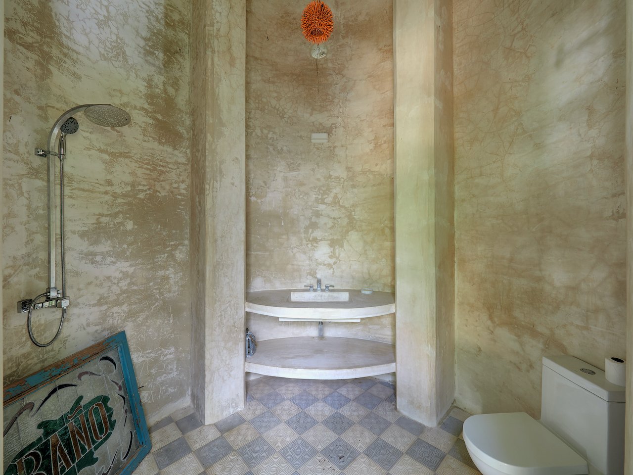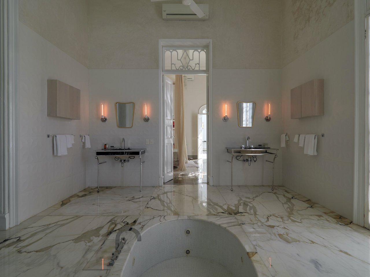 The upper story is reached by a terrazzo floating staircase and is surrounded on three sides by tiled exterior terraces with dramatic views of the property. You can retire to the spacious guest bedrooms with tiled ensuite bathrooms featuring Italian statuary marble sinks.