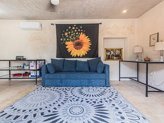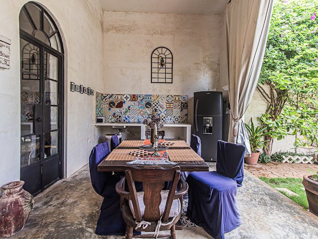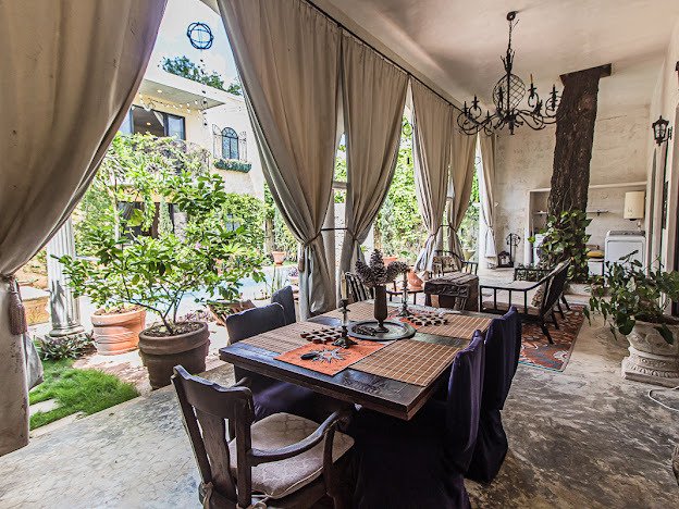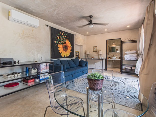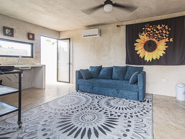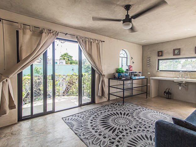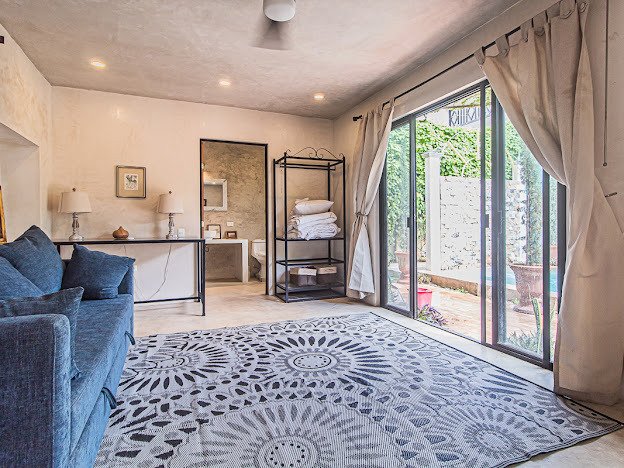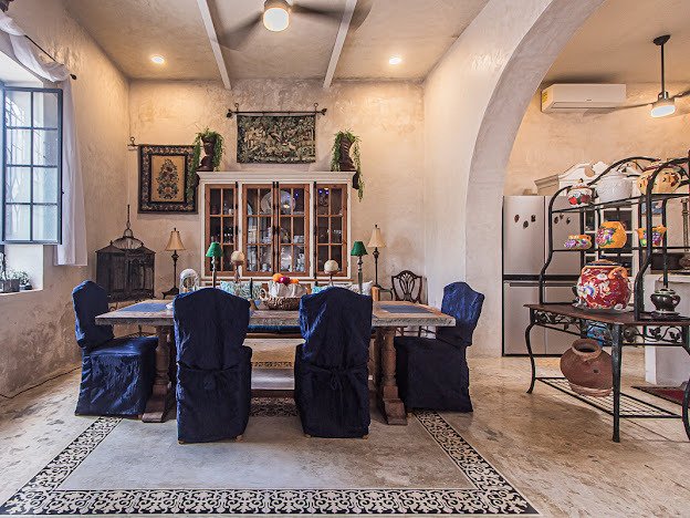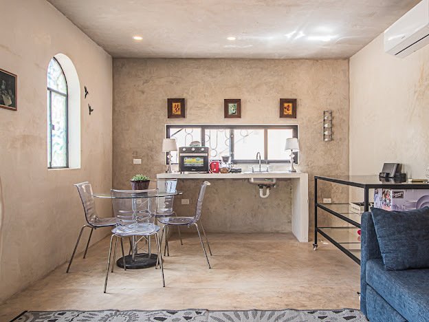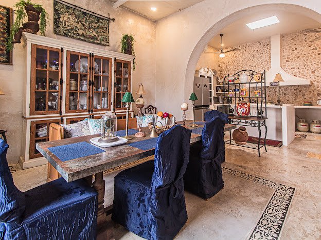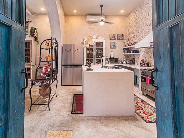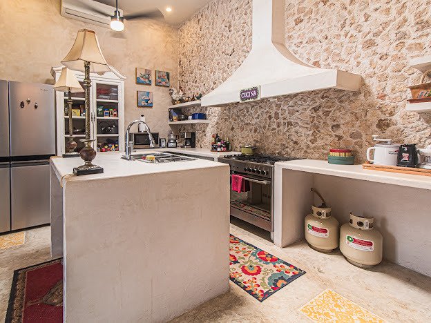 Casa Candelabro greets guests with a true foyer that opens up to the great living space flanked by symmetrically placed arches. Adjacent to the living space is the charming kitchen with its functional island, Chukum Campana and stone accent wall. The kitchen is outfitted with a commercial stove, refrigerator and dishwasher.