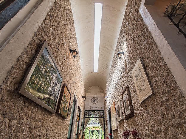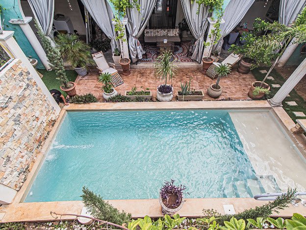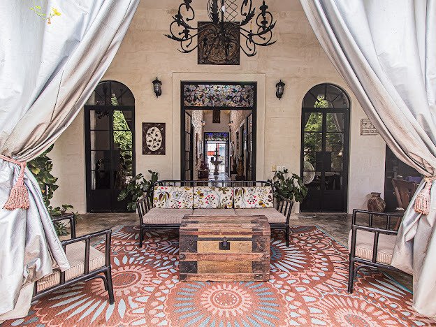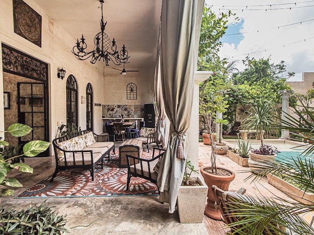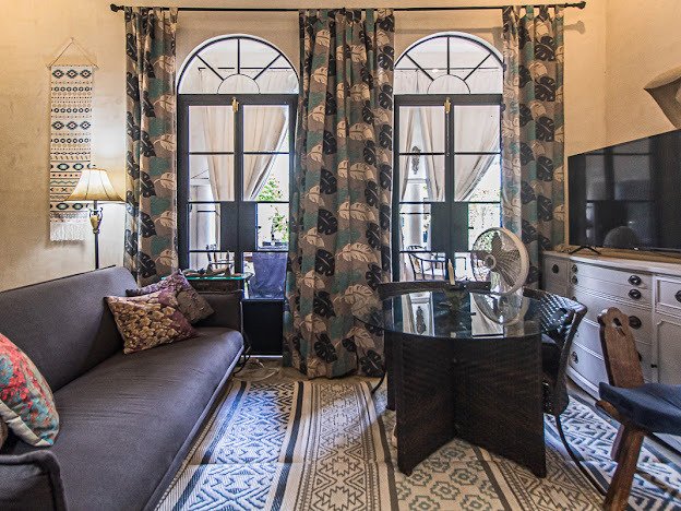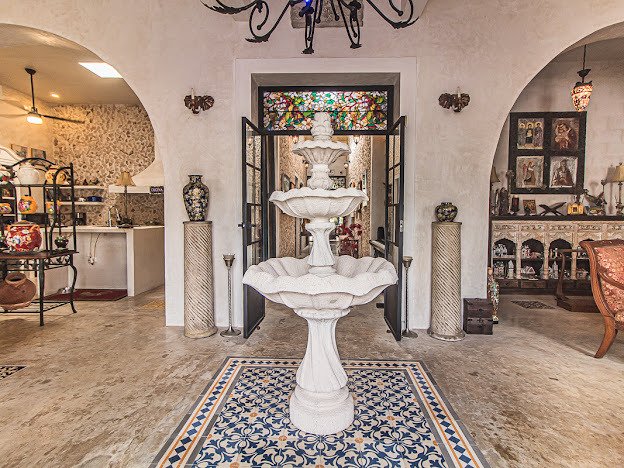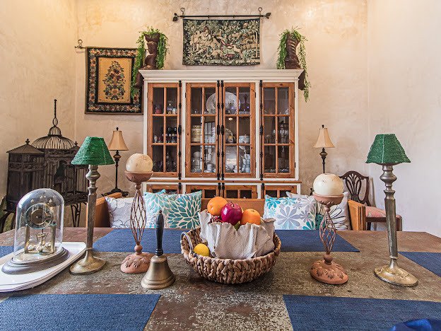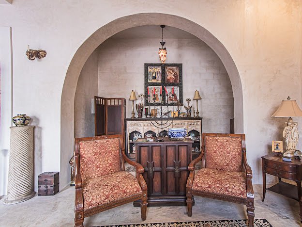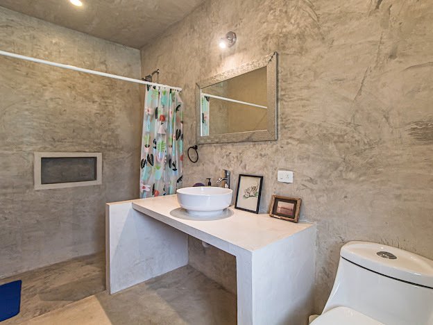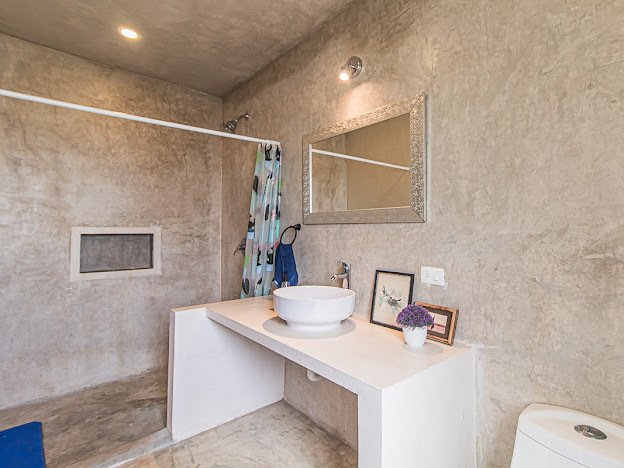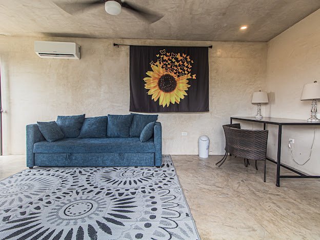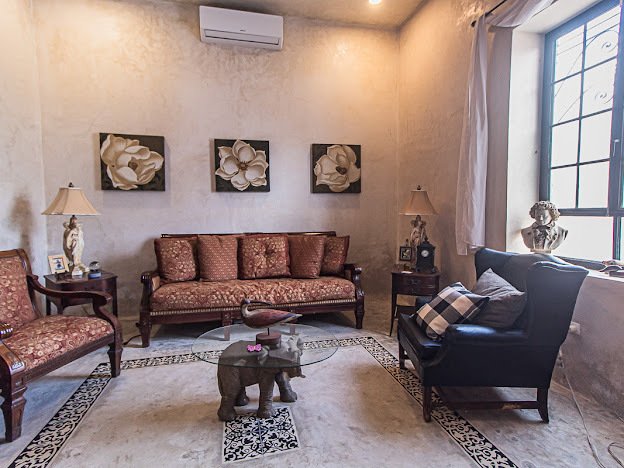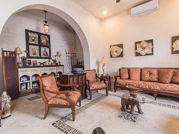 Casa Candelabro greets guests with a true foyer that opens up to the great living space flanked by symmetrically placed arches. Adjacent to the living space is the charming kitchen with its functional island, Chukum Campana and stone accent wall. The kitchen is outfitted with a commercial stove, refrigerator and dishwasher.