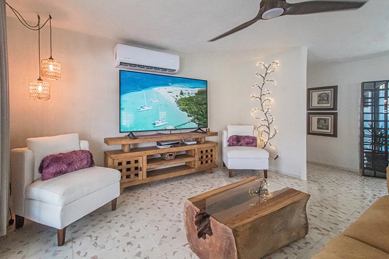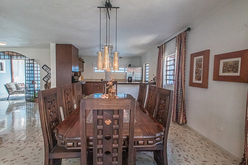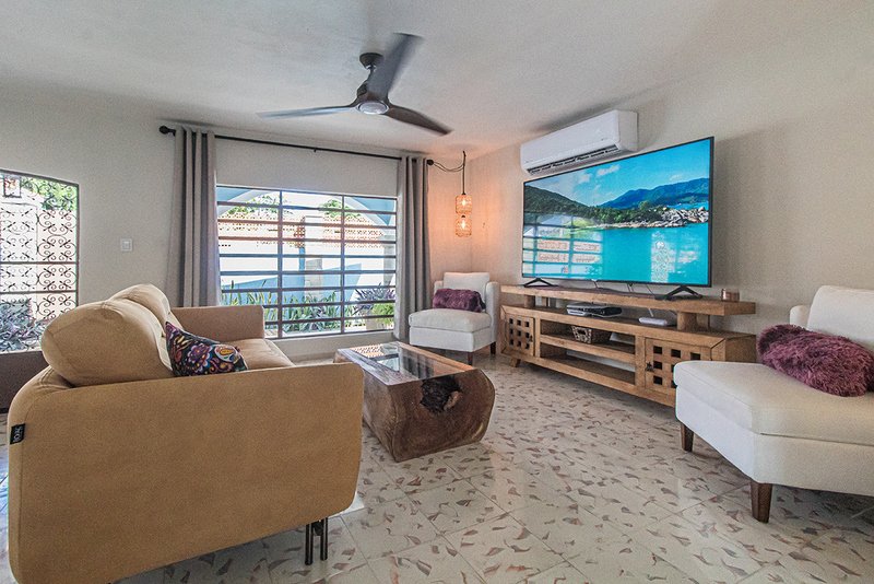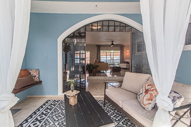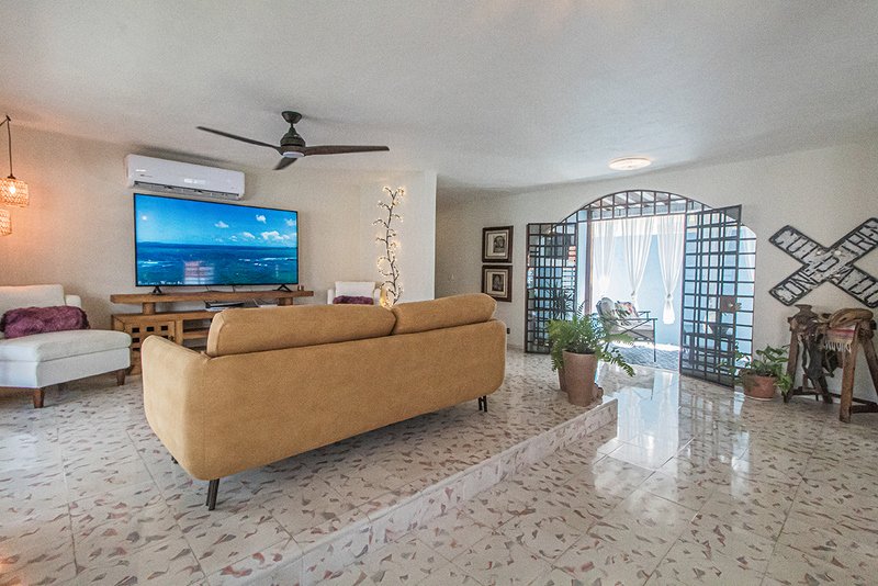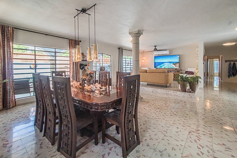 Casa Brisas charmes guests with the front porch that greets everyone as they enter the property. The alluring interior is an open concept layout that integrates the equipped kitchen, living room and dining room in one space.