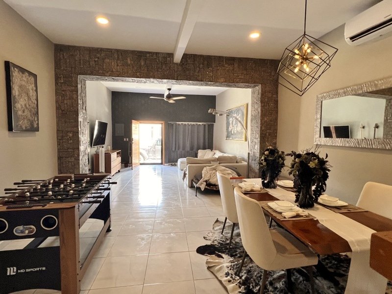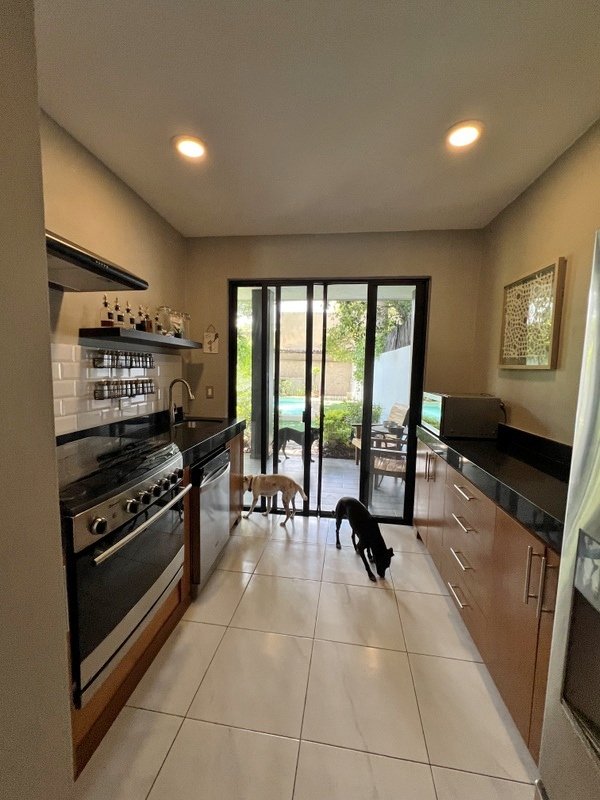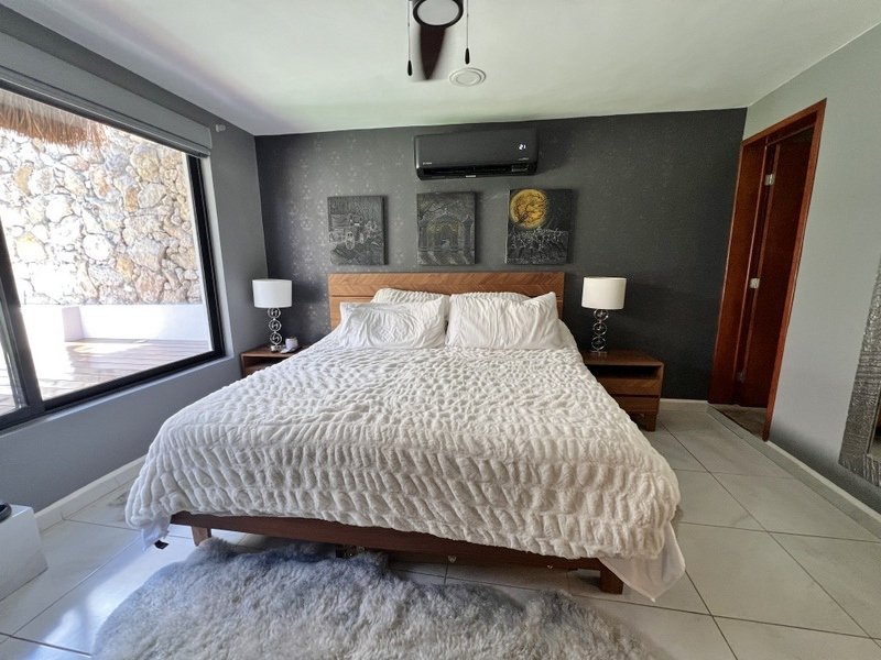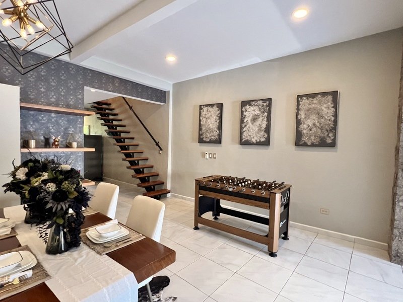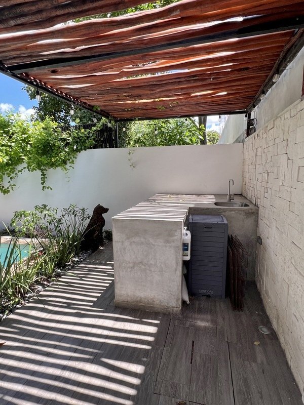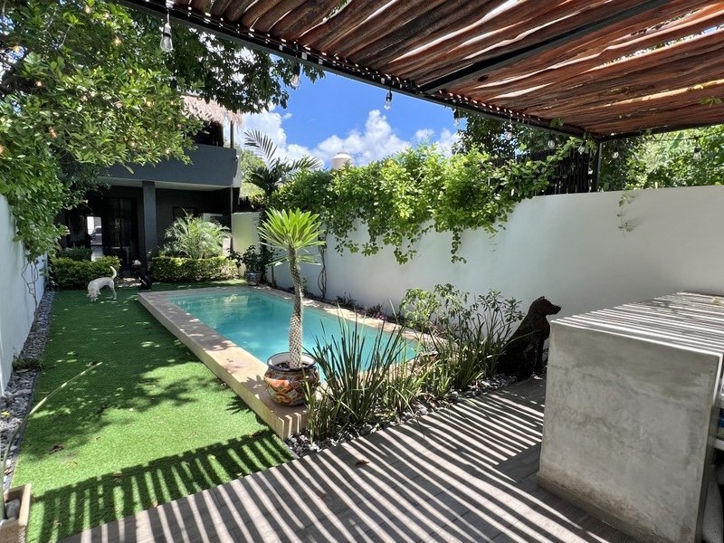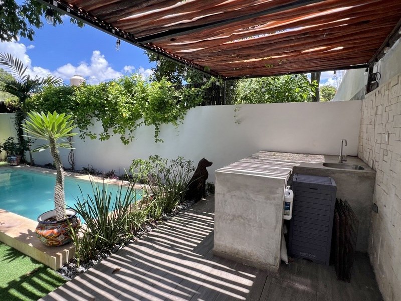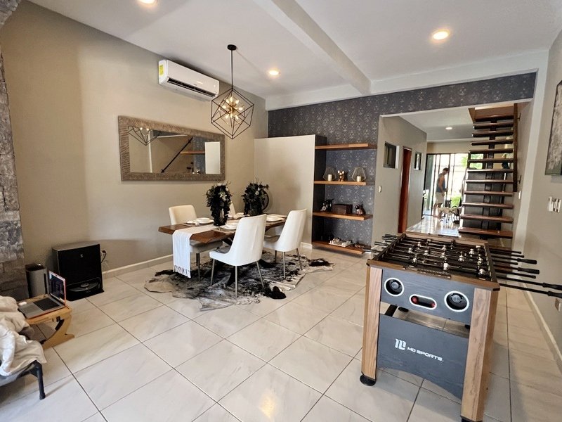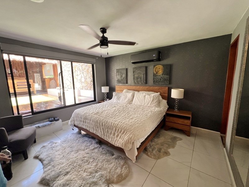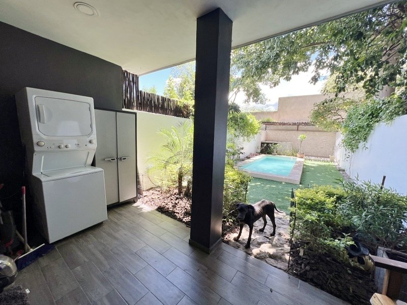 This lovely home offering complete privacy is located in the popular Santiago neighborhood. Remodeled in 2022 and freshly painted this home is in move in condition. Rooms are spacious and beautifully appointed. All appliances and furniture are included. There are ten 330 watt solar panels and four 550 watt panels. This Smart home is equipped with Wi-Fi and Alexa enabled lights and air conditioning. The kitchen is modern with high end appliances and granite countertops. Just outside the kitchen is the laundry area with a washer and dryer. One bedroom with on suite bathroom is located on the ground floor . The second story offers a large master bedroom with on suite, a private patio, sun area and a large palapa. This bedroom overlooks the private enchanting low maintenance garden with filtered pool. The garden has a BBQ area with a sink. Special features of this home are custom painted walls in the living room and dining room and a bricked arch in the living room. The front doors are glass with secondary wood door offer excellent insulation. The EV charger is also included. This beautiful home awaits you.