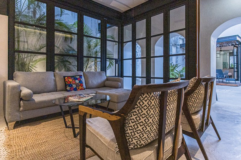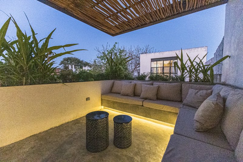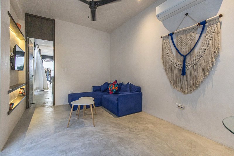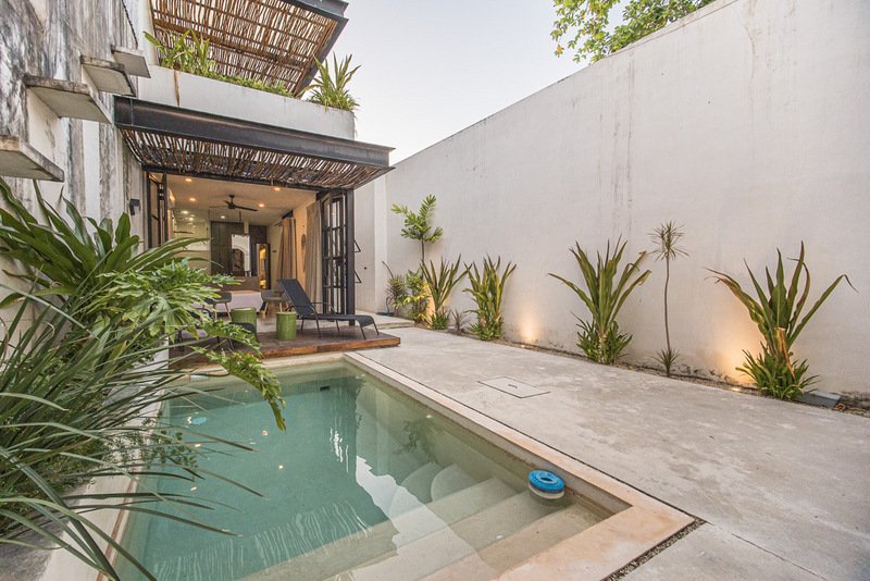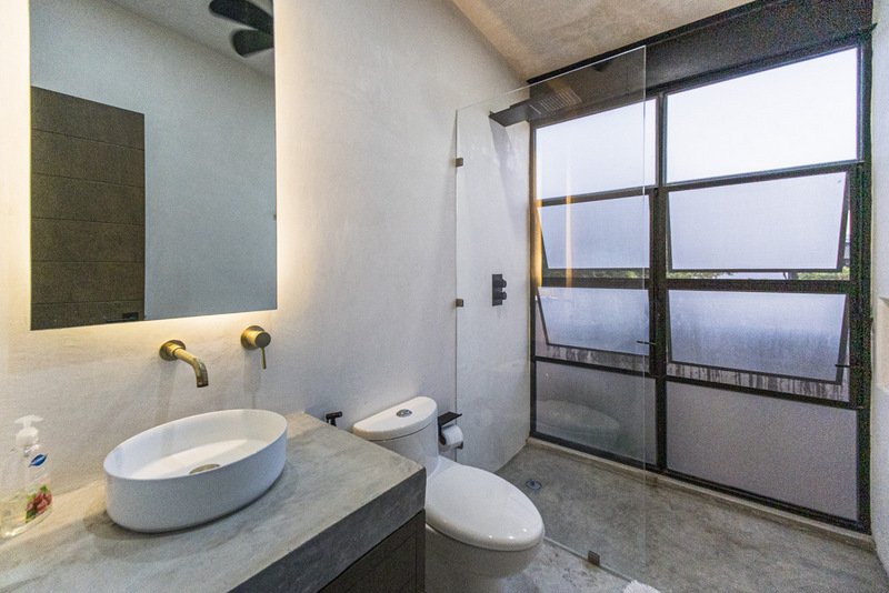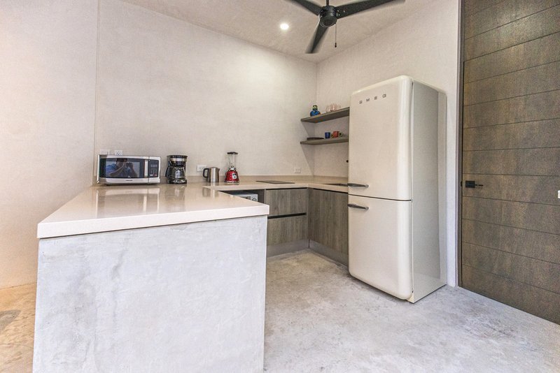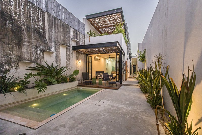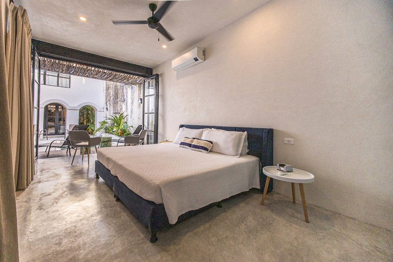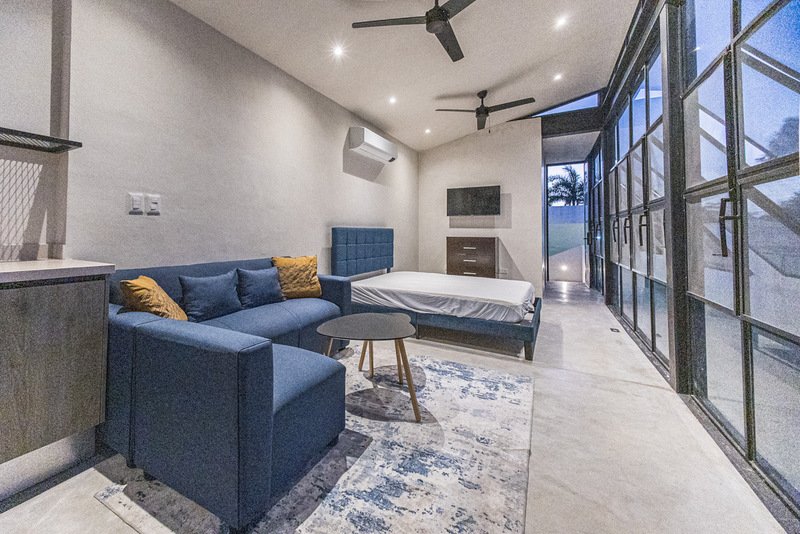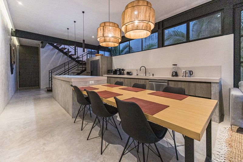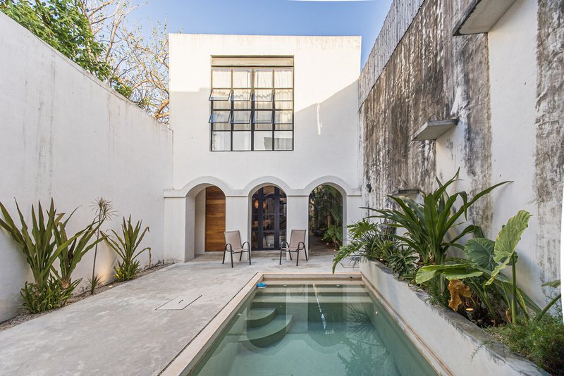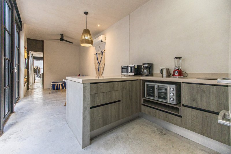 Iron glass doors and windows provide breezes and tons of natural light, the casita integrates two apartments with an elegant open layout design. The downstairs unit features a spacious bedroom that faces the central patio, Tzalam wood deck, and the swimming pool complete with full bathroom, fully equipped kitchen, living and dining areas. Upstairs is a 1 bedroom, 1 full bathroom complete with a private terrace, kitchenette, living and dining area.
