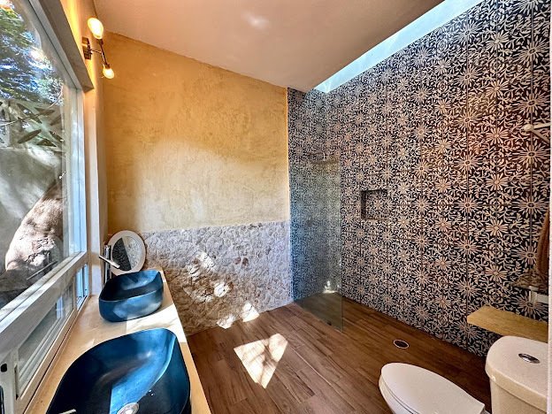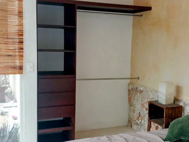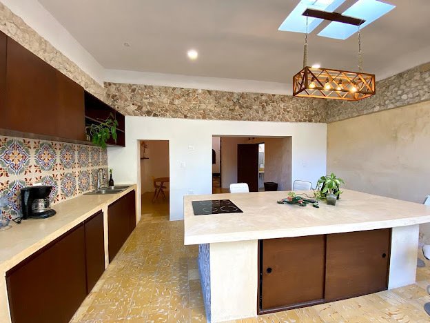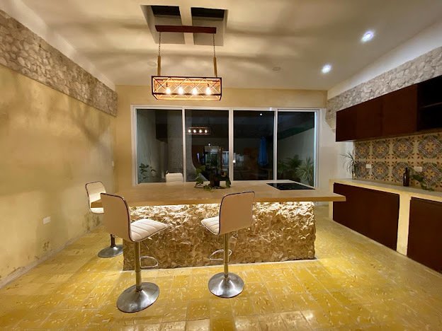 Kitchen and dining room combined with pool views, island with electric cooktop, wooden cabinets, Chukum finish, pasta tile flooring, and air conditioning. Half bathroom for guests. Covered parking. 2.5 m x 6 m swimming pool with waterfall. Barbecue area. Outdoor terrace. Full bathroom facing the pool. Laundry room and appliances together. The entrance area includes air conditioners, fans, electric heaters, closets,