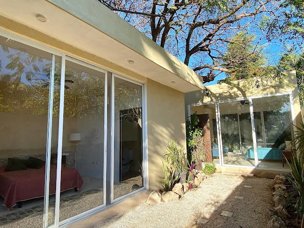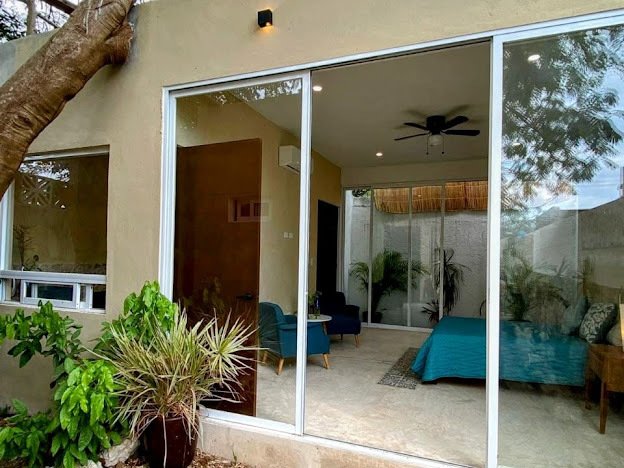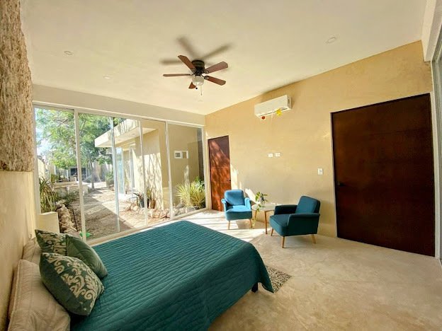 It consists of: Master bedroom with full bathroom, walk-in closet, interior garden, terrace view, and air conditioning, a secondary bedroom with full bathroom, closet, pool view, air conditioning, and ceiling fan. Living room with double-height ceilings and air conditioning.