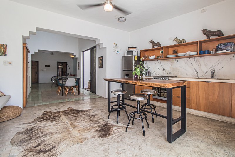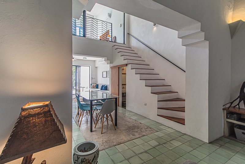 With an open concept design and inviting ambiance, this home welcomes with a colonial beamed high ceiling living room, dining room, equipped kitchen, guest bath and indoor garden that brings nature and breeze to the house.