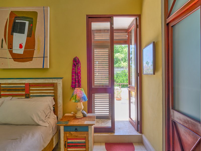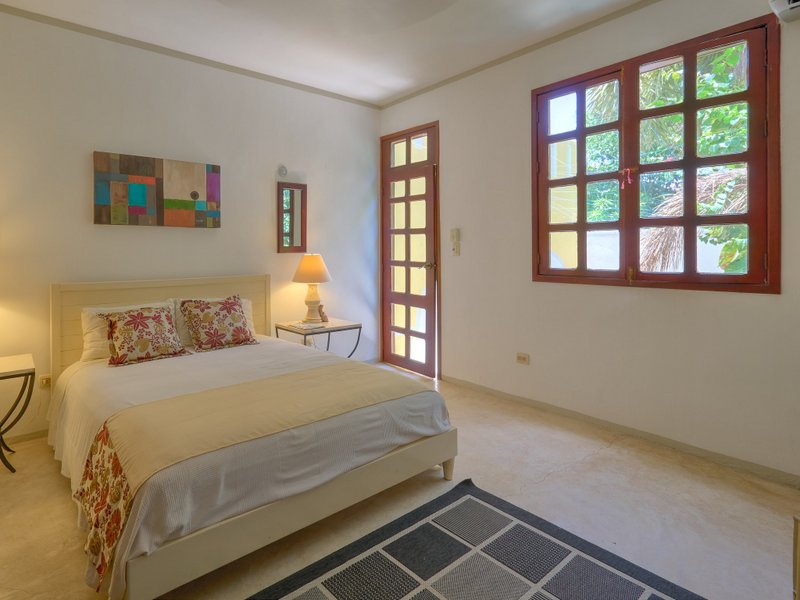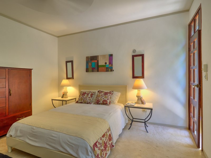 The primary residence radiates sophistication and practicality. On the lower level, a stunning living room greets you, accompanied by a dining area and a fully outfitted kitchen that includes a cooking island, a professional-grade gas stove and oven, a dishwasher, and a refrigerator. The ground floor is also home to a comfortable bedroom with an en-suite bathroom, a half bath, and a utility room equipped with a washer and dryer. A stunning staircase featuring soaring ceilings and skylights ascends to the upper level, where a magnificent and expansive master suite is located. This opulent suite boasts a walk-in closet, a private bathroom, and a master terrace complete with a covered Jacuzzi. At night great place to relax and star gaze. Or watch the tropical birds fly overhead. From the wooden-planked balcony, one can take in the views of the garden and pool, or unwind on the spacious front terrace, which is also included in the master suite. Furthermore, there is an additional bedroom with an en-suite bathroom on this level.